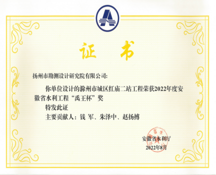在經(jīng)過申報(bào)單位申報(bào)、主管部門審查推薦的基礎(chǔ)上,經(jīng)資格初審、專家組現(xiàn)場(chǎng)復(fù)查、評(píng)審委員會(huì)評(píng)審、廳網(wǎng)站公示、主管部門批準(zhǔn)等評(píng)選程序后,我公司設(shè)計(jì)的“滁州市城區(qū)紅廟一站工程”“滁州市城區(qū)紅廟二站工程”2個(gè)項(xiàng)目喜獲“禹王杯”獎(jiǎng)項(xiàng)。